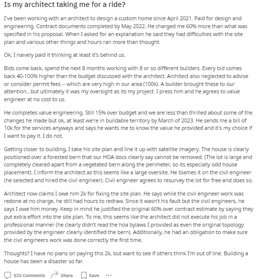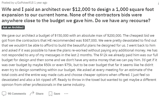 Or you’ll have to go back to the drawing board and pay your designer to have a less expensive project designed…
